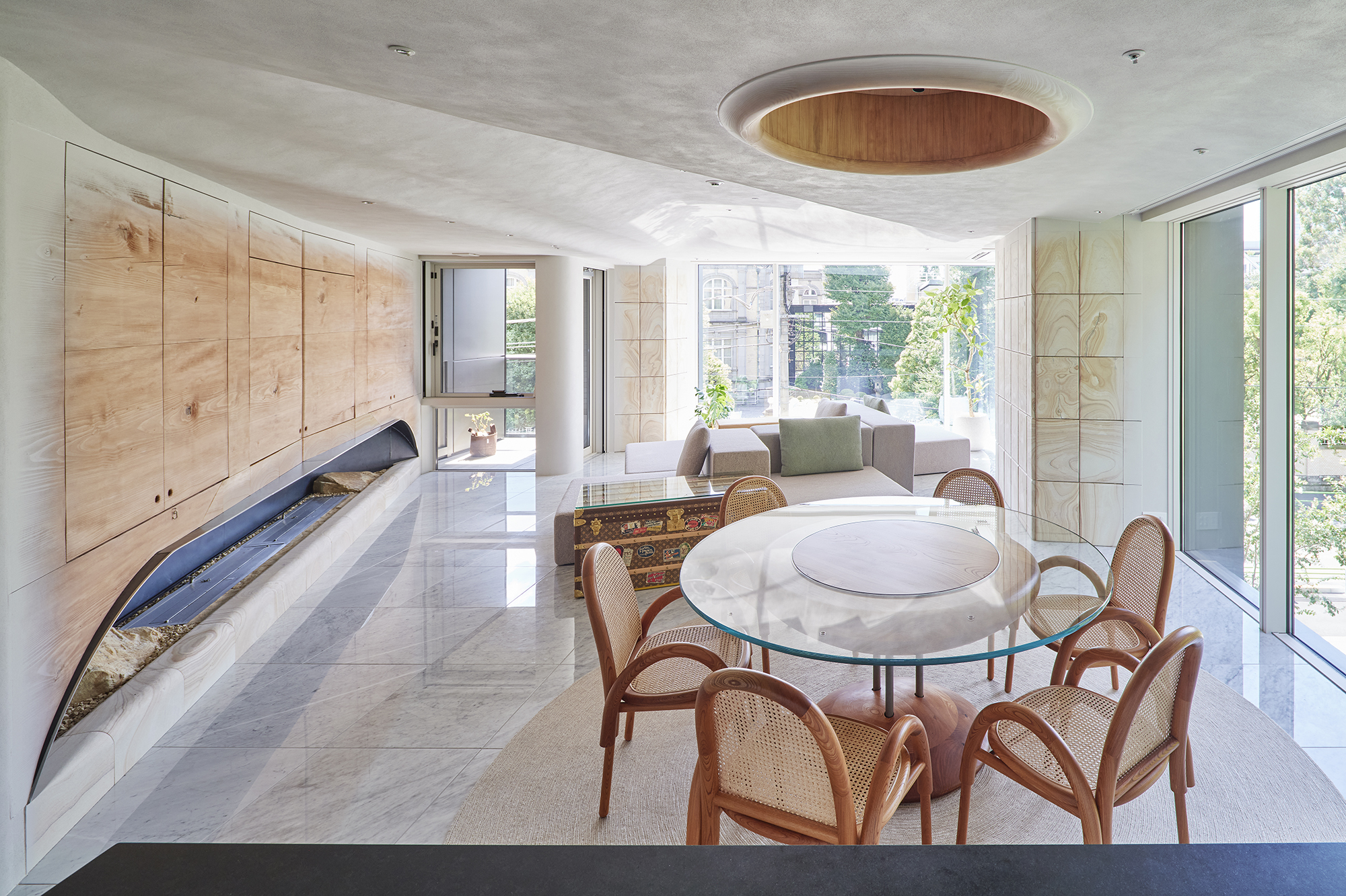 様々な曲線とやわらかな素材が溶け合い、触れたくなる温かさをもつ住空間である。