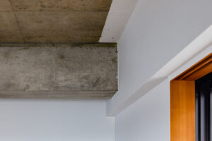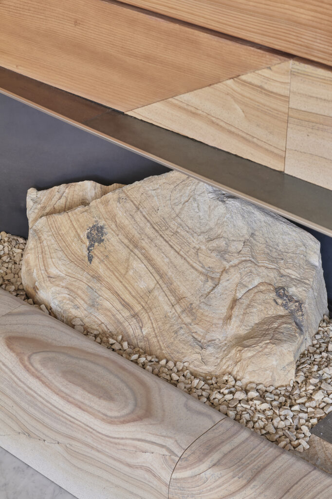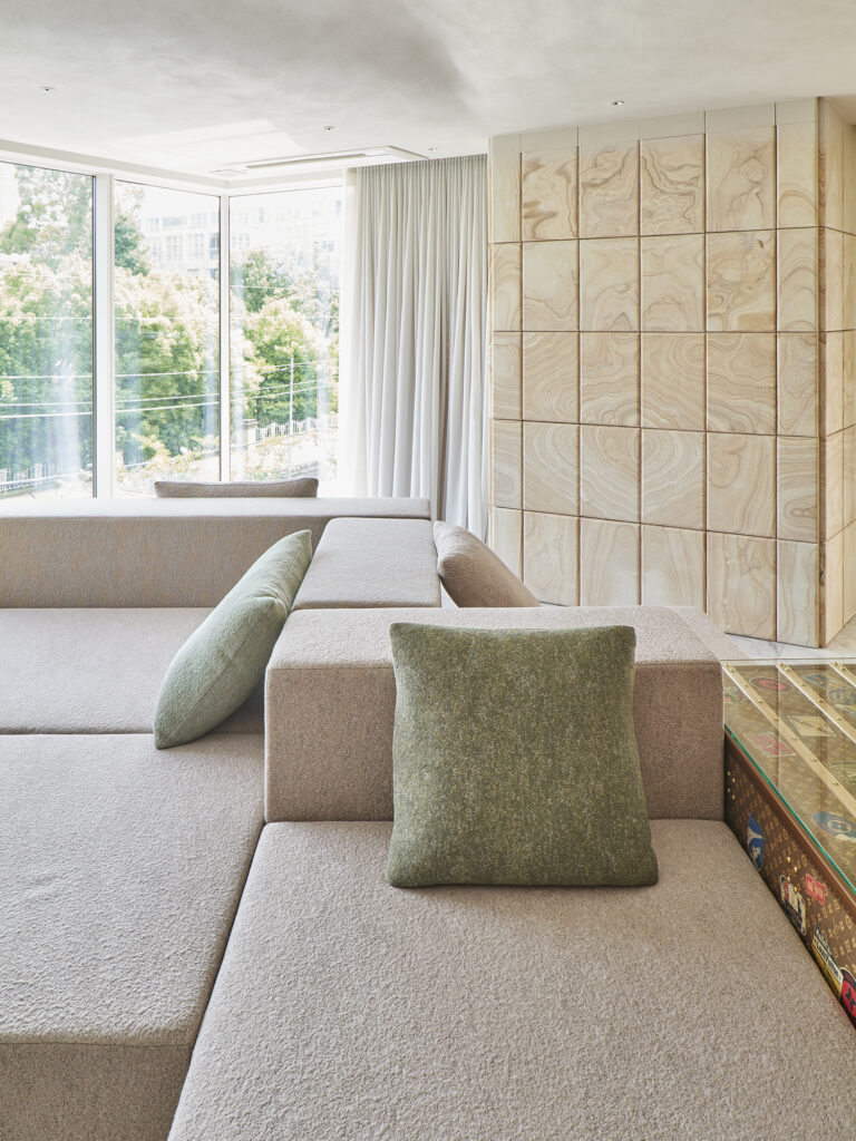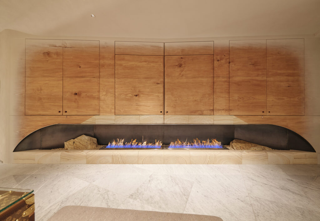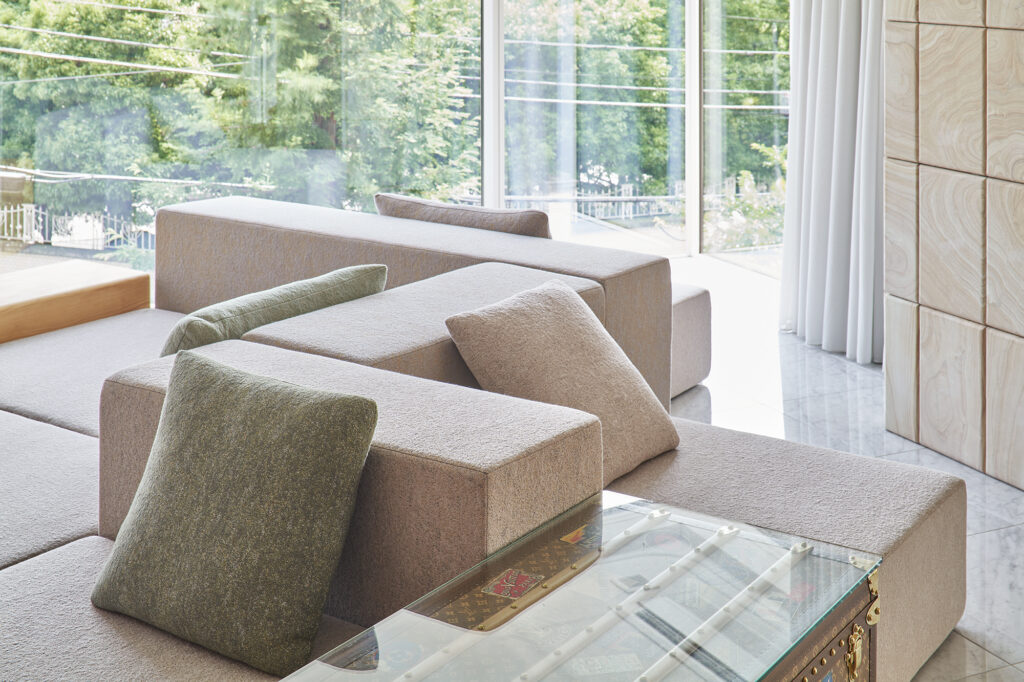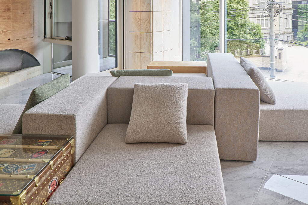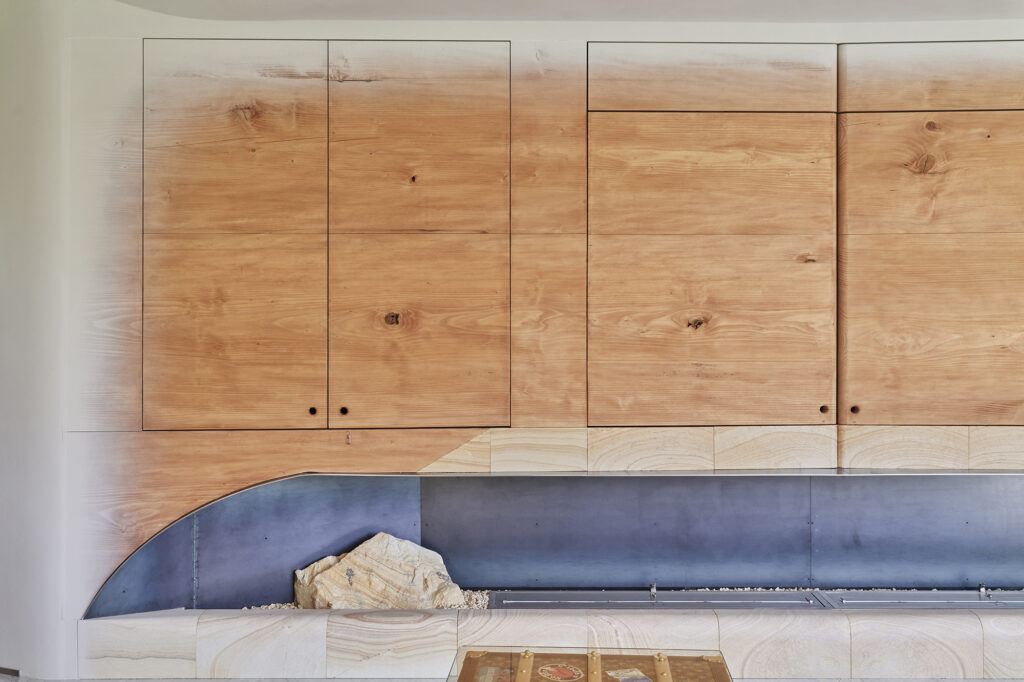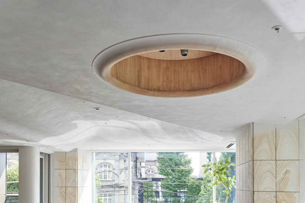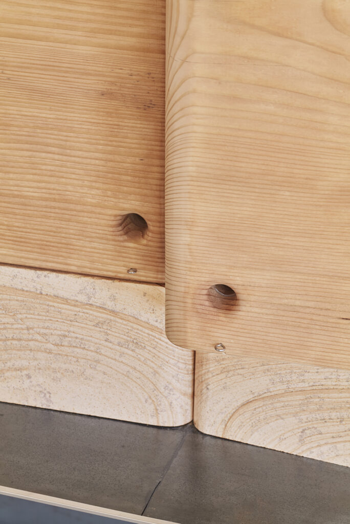 時の風化がもたらすその風景に対して、手仕事で素材にやわらかな表情を与え、空間や家具へ温もりを投影した。