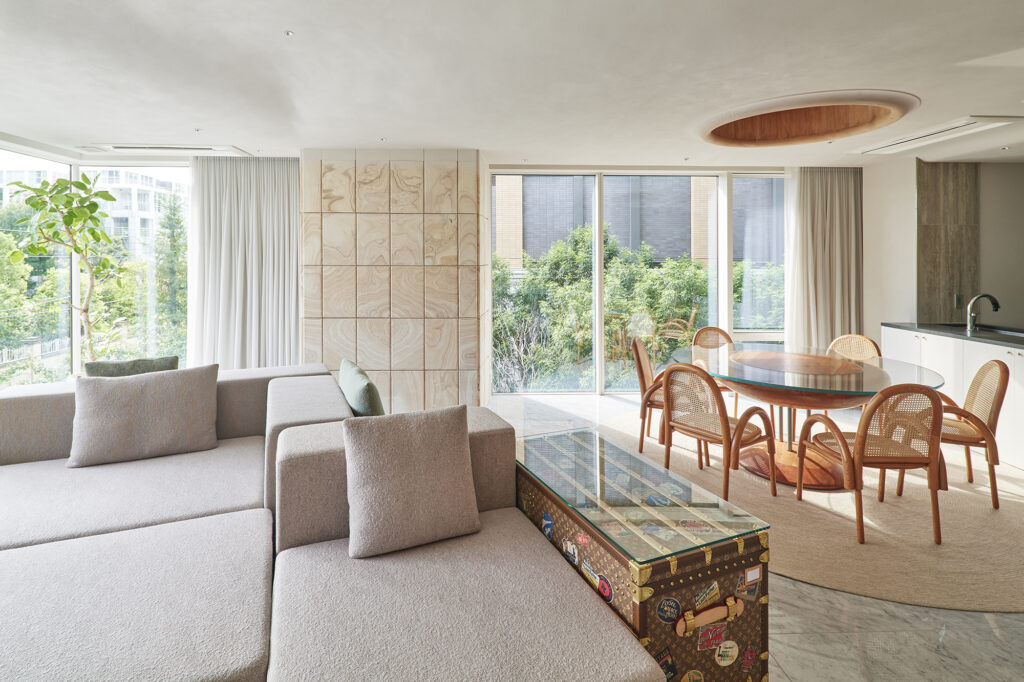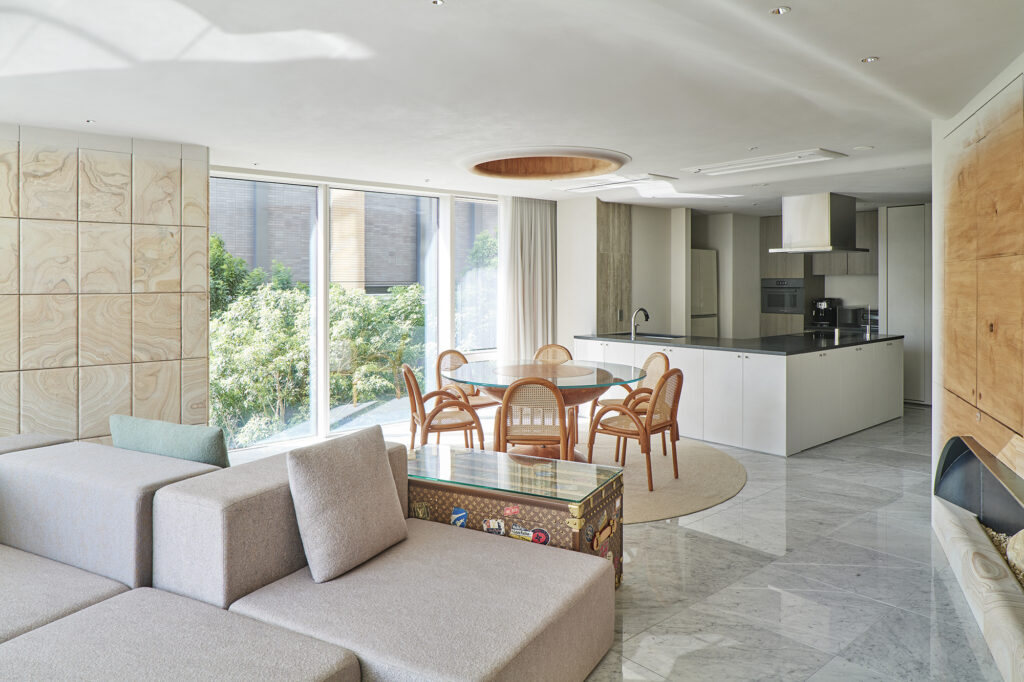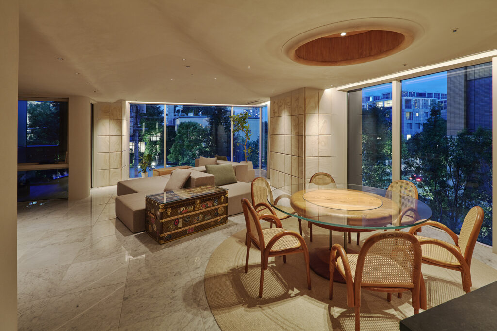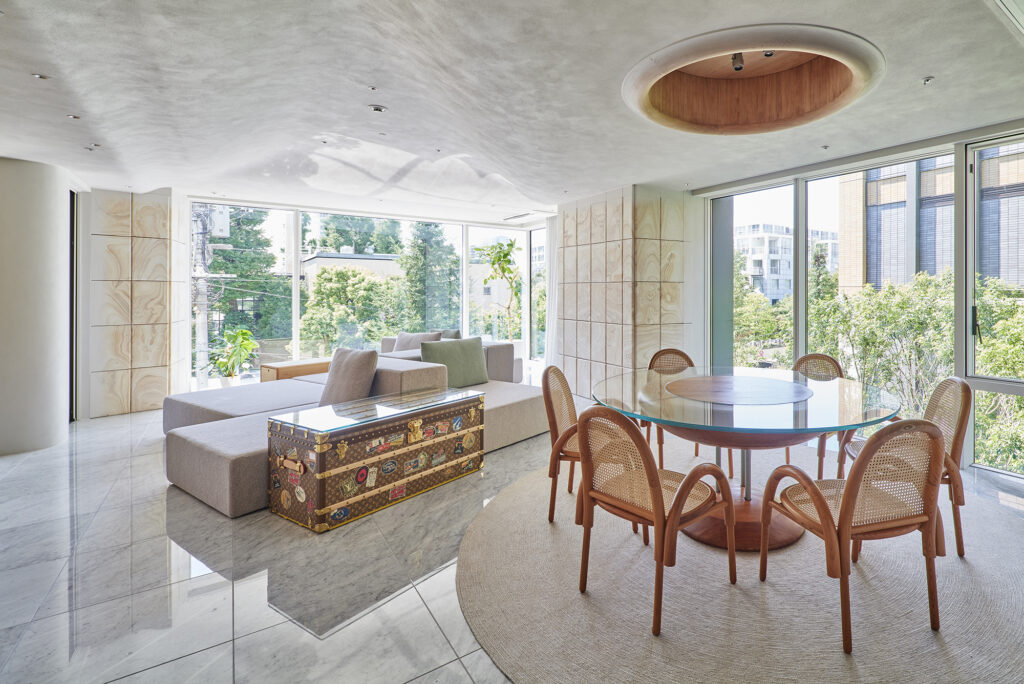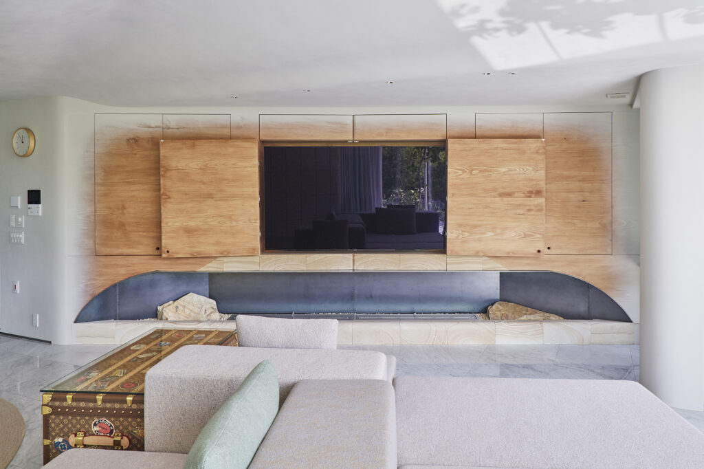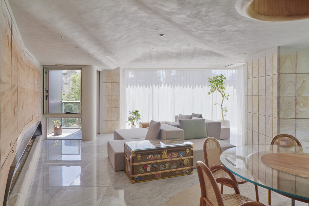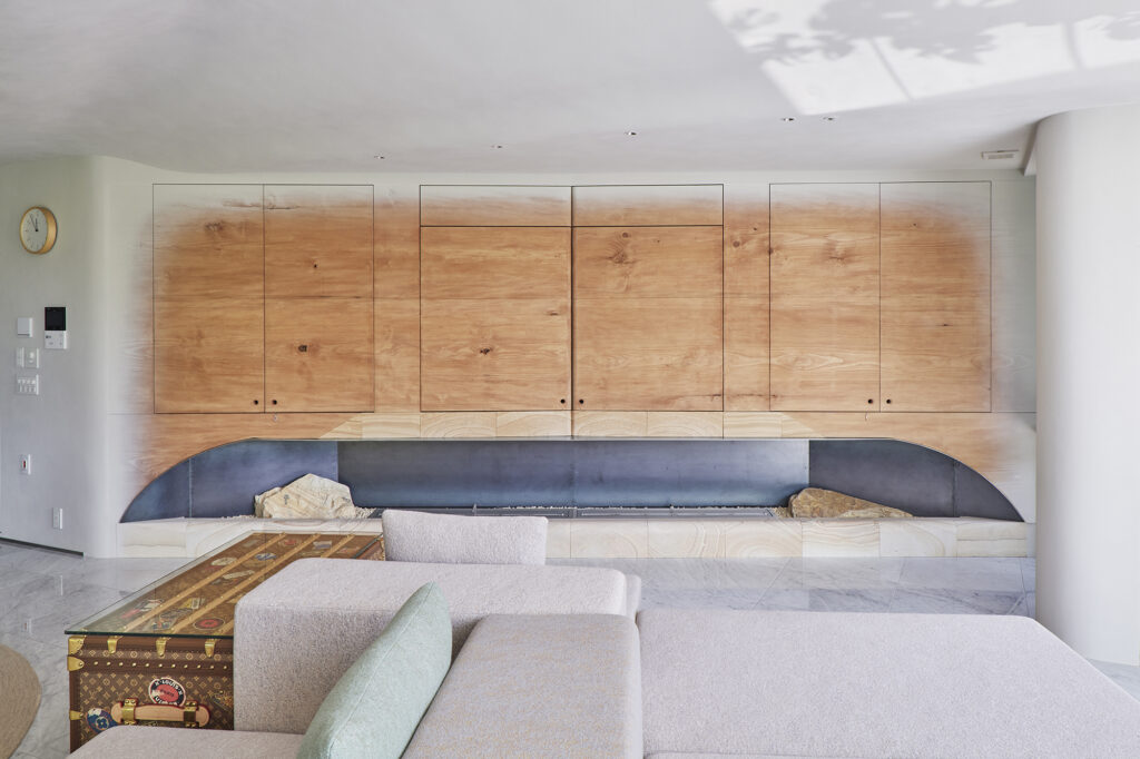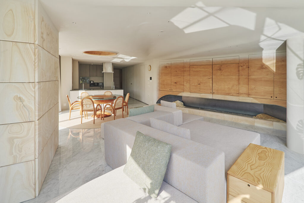 様々な曲線とやわらかな素材が溶け合い、触れたくなる温かさをもつ住空間である。